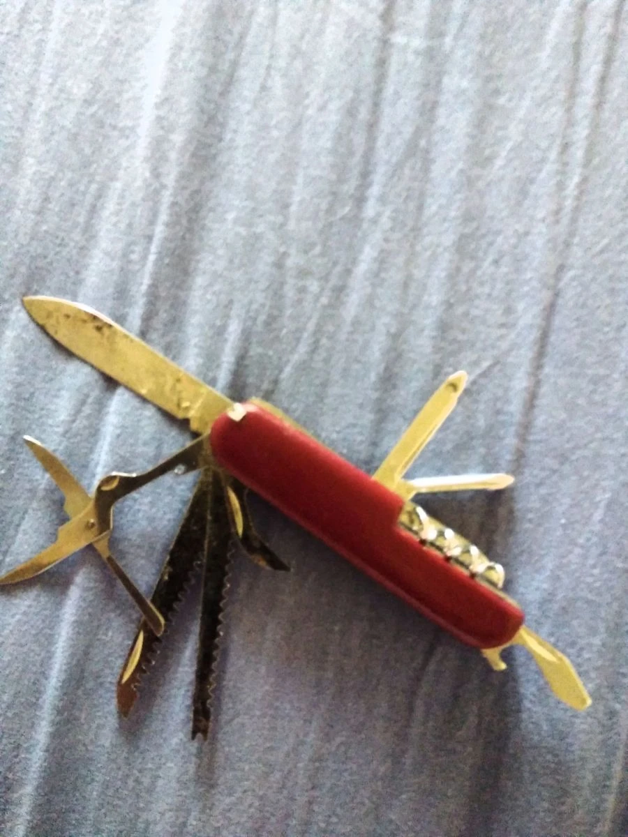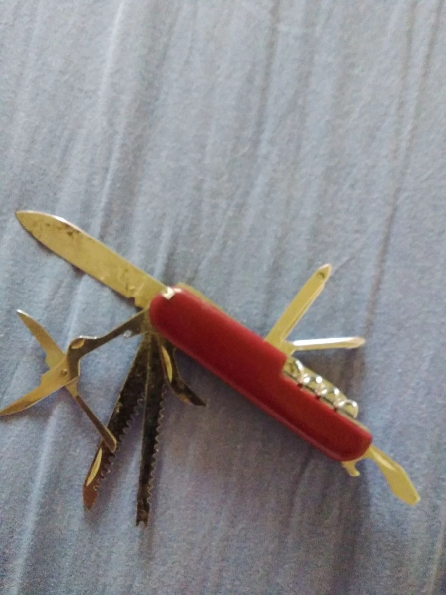 Έχει ψαλίδι, 2 πριόνια, λίμα, τσιμπιδακι, μαχαίρι, 2 ανοιχτειρια, κατσαβίδι, σταυροκατσαβιδο, μαχαιράκι,και άλλα