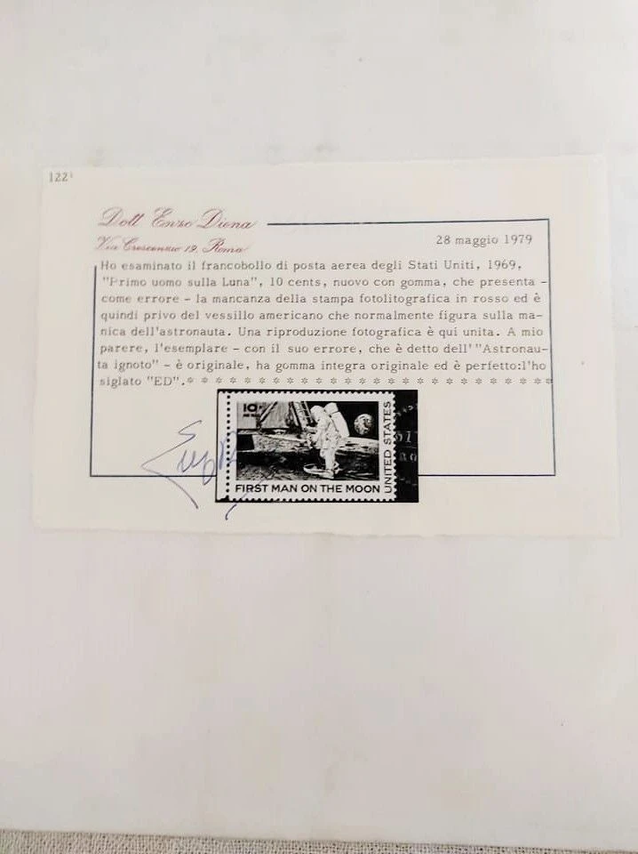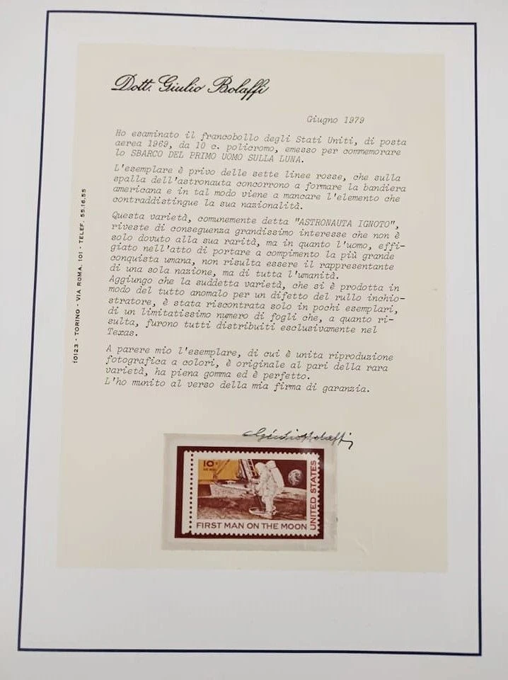 Γραμματόσημα «Άγνωστος αστροναύτης» (του «Πρώτου ανθρώπου στη Σελήνη»), που εκδόθηκε το 1969 από την Ταχυδρομική Υπηρεσία των Ηνωμένων Πολιτειών με την ευκαιρία της διαστημικής αποστολής Apollo 11 “Τα γραμματόσημα, τα οποία τυπώθηκαν και πραγματικά ταξίδεψαν στο διαστημόπλοιο Apollo κατά τη διάρκεια της αποστολής, απεικονίζαν τον Νιλ Άρμστρονγκ την ιστορική στιγμή που πάτησε το πόδι του στο σεληνιακό έδαφος. Η αναφορά στον αστροναύτη δεν είναι σαφής , επειδή ένας νόμος εμπόδιζε την Ταχυδρομική Υπηρεσία των Ηνωμένων Πολιτειών να απεικονίζει ζωντανούς ανθρώπους σε γραμματόσημα, αλλά βλέπαμε τις κόκκινες και άσπρες ρίγες στον αριστερό ώμο της διαστημικής στολής που κάνουν τον αντιπροσωπευόμενο χαρακτήρα λιγότερο ανώνυμα. Αντίθετα, στην παραλλαγή “Άγνωστος αστροναύτης” οι επτά κόκκινες ρίγες απουσιάζουν λόγω ανωμαλίας εκτύπωσης. Ως εκ τούτου, ακόμη και η συγκαλυμμένη αναφορά του Άρμστρονγκ λείπει και κάνει αυτά τα γραμματόσημα ένα εξαιρετικό δείγμα σε κάθε συλλογή διαστημικού φιλοτελισμού, δεδομένης και της σπανιότητάς της αφού σήμερα υπάρχουν μόνο μερικές εκατοντάδες δείγματα στον κόσμο. -3 γραμματοσημα με λαθη(1μπλε 1πολυχρωμο 1μαυροασπρο)