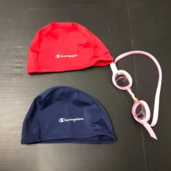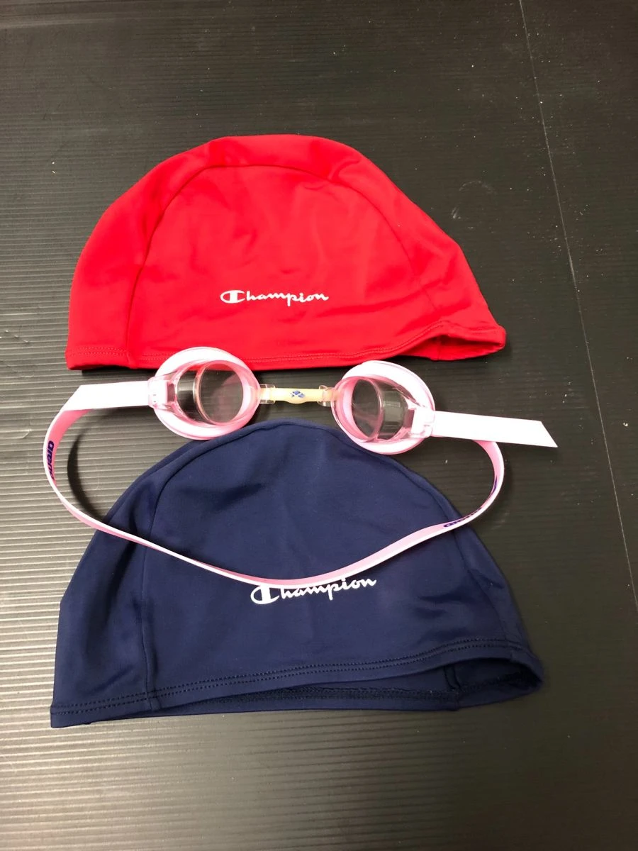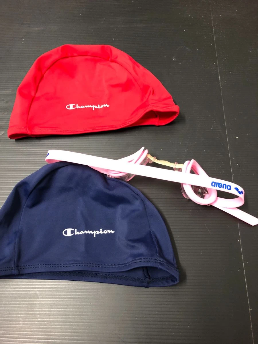 2 παιδικά σκουφακια Champion και ένα ζευγάρι γυαλιά κολυμβητηρίου Arena σε άριστη κατάσταση