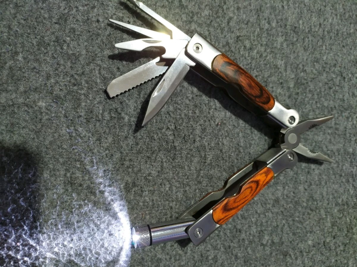 Πολυεργαλειο Επιβίωσης έχει Πενσα, φακό ,μαχαίρι κανονικό , μαχαίρι πριονοτο ,σταυροκατσαβιδο και ανοιχτηρι