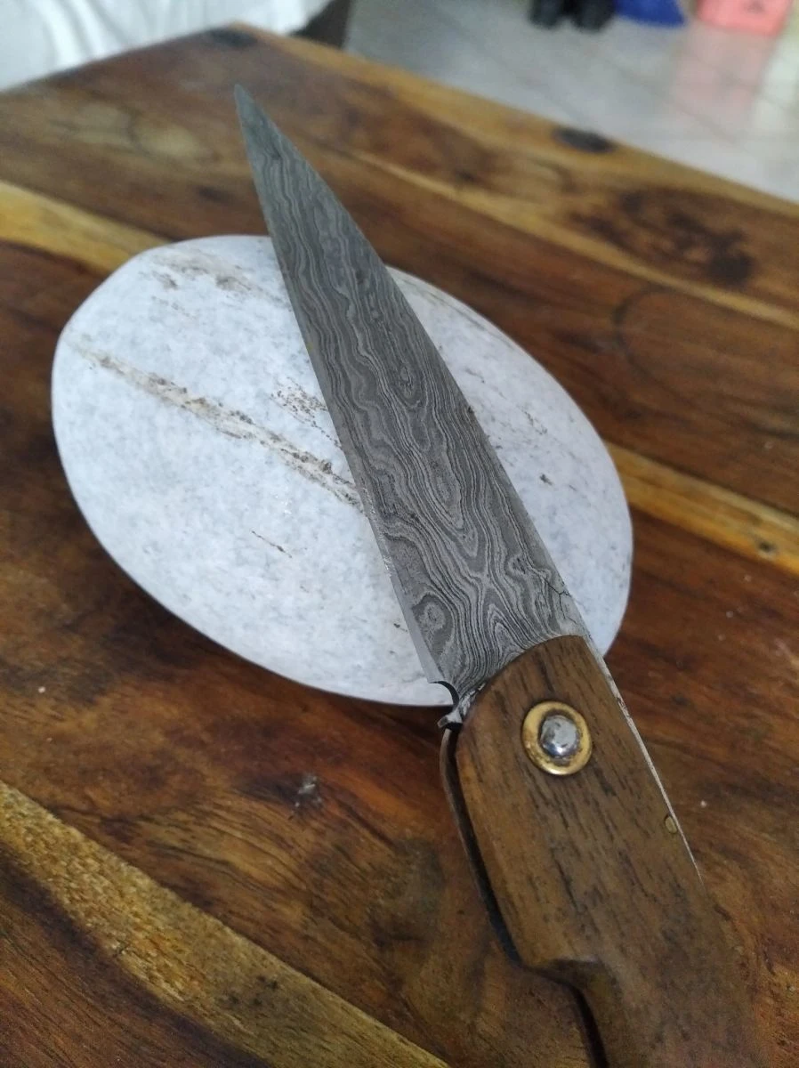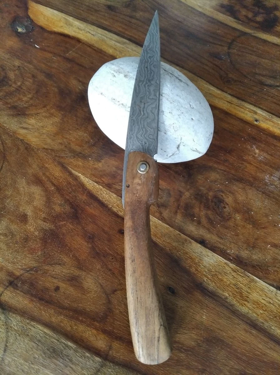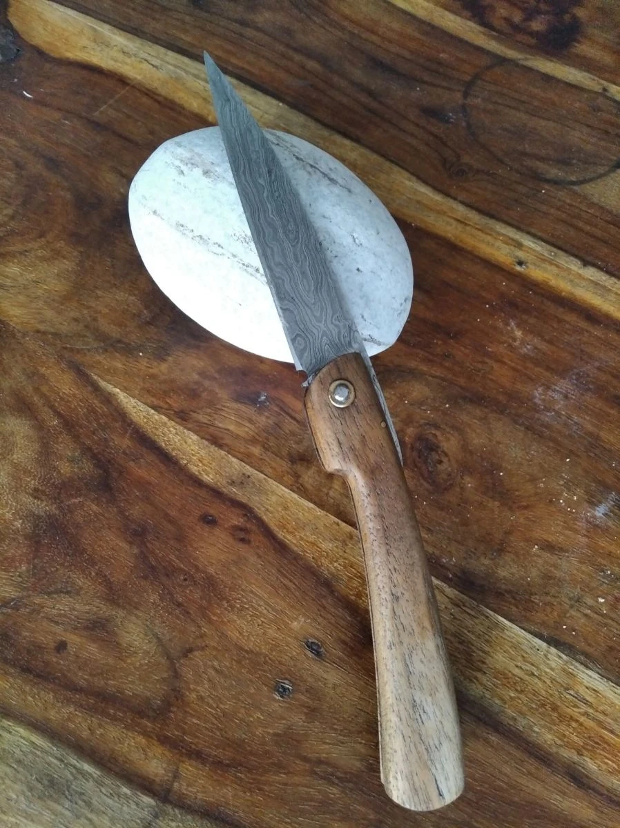 Χειροποίητος σουγιάς άριστης κατάστασης (καινούριος) με δαμασκηνή λεπίδα και λαβή από ξύλο τικ. Χώρα προέλευσης Πακιστάν. Διαστάσεις όπως φαίνονται στην φωτογραφία.
