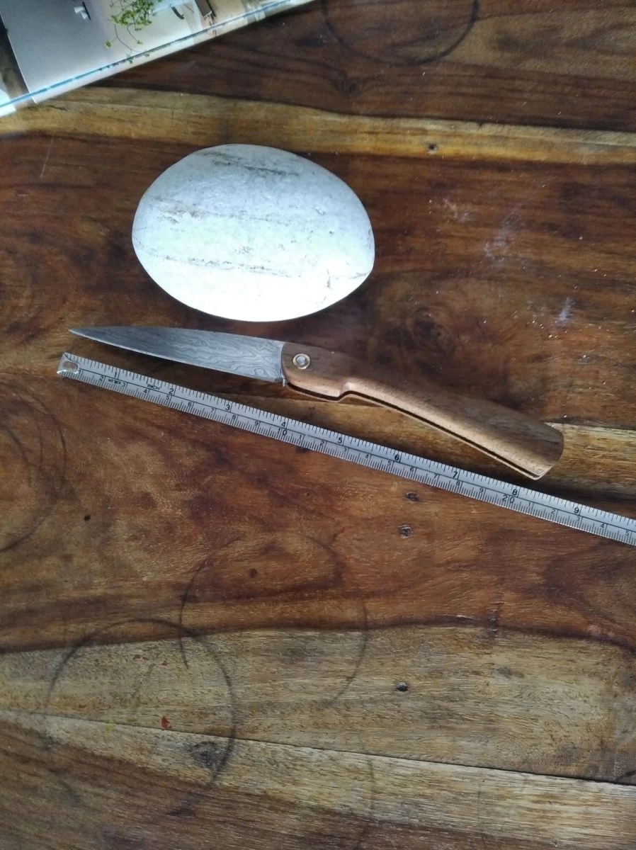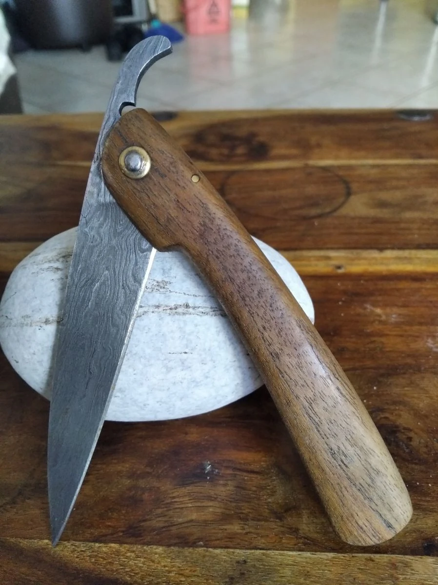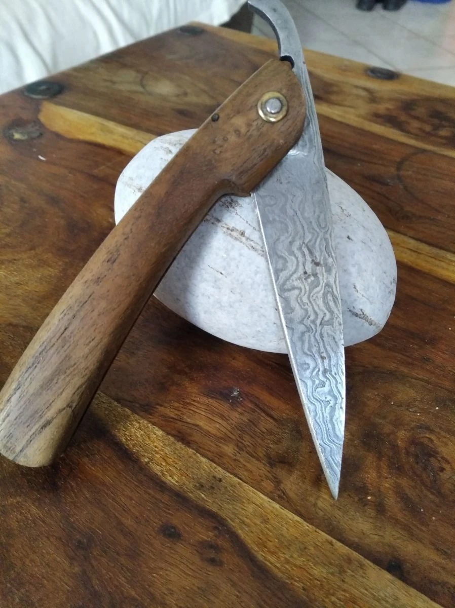Χειροποίητος σουγιάς άριστης κατάστασης (καινούριος) με δαμασκηνή λεπίδα και λαβή από ξύλο τικ. Χώρα προέλευσης Πακιστάν. Διαστάσεις όπως φαίνονται στην φωτογραφία.
