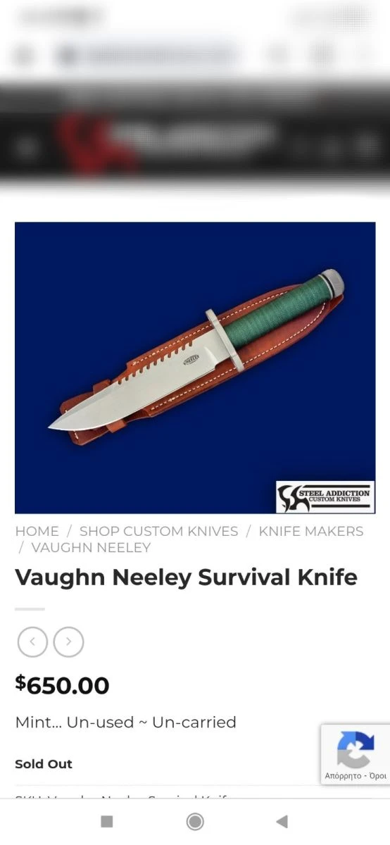 Vaughn Neeley knife …η ελίτ των μαχαιριών επιβίωσης προερχόμενο από εργαστήρι του Colorado, made in usa ,εξ’ολοκλήρου χειροποίητο ,όπως και η δερμάτινη θήκη του από τον γνωστό του χώρου ,τεχνίτη Vaughn Neeley. λεπίδα:7” ιντσες, 440C με 58-60 hrc,hollow grind–γεωμετρία λεπίδας,κοίλη λαβή 304 ατσάλι και βιδωτό καπάκι 440c,οδοντωτό το άνω μέρος της λεπίδας με κλίση το κάθε δόντι κάνοντας εύκολο το πριόνισμα ξύλου,πριονωτό το άνω μέρος της μύτης της λάμας .πάχος οδοντωτού μερους λάμας -6,6 mm.Το καπάκι είναι ιδιαίτερα στοιβαρό -συμπαγές κατάλληλο για θρυμμάτισμα ή κάρφωμα καρφιών.εσωτερικά φέρει ανακλαστική επιφάνεια σε περίπτωση διάσωσης.το δέσιμο της κοίλης λαβής με την λάμα είναι αξιοσημείωτο-μοναδικό ,καθιστώντας το μαχαίρι άθραυστο- ανθεκτικό σε κάθε καταπόνηση. δεν συνοδεύεται από κιτ επιβίωσης.η δερμάτινη θήκη φέρει πέτρα ακονίσματος. Η Αξία του είναι άνω των 650,παραπέμπω σε ebay, google και f/b σχετικά για Vaughn neeley knives ..πληροφορίες. για περισσότερες φωτογραφίες παρακαλώ επικοινωνήστε μαζί μου
